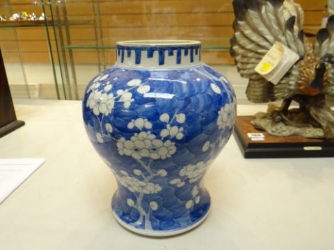 COLLECTION OF ORIENTAL PORCELAIN, including two Chinese 19th Century blue and white vases, Japanese Imari shouldered vase, Kutani rectangular tray decorated with samurai, Chinese celadon baluster jar and cover (drilled, converted to electricity), two sancai glazed models of foo dogs and a Samson hexagonal jar and cover (9)The large prunus jar has no damage, just very dirty.