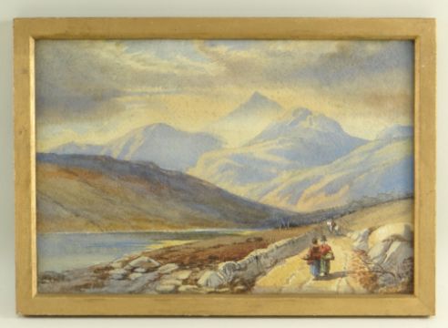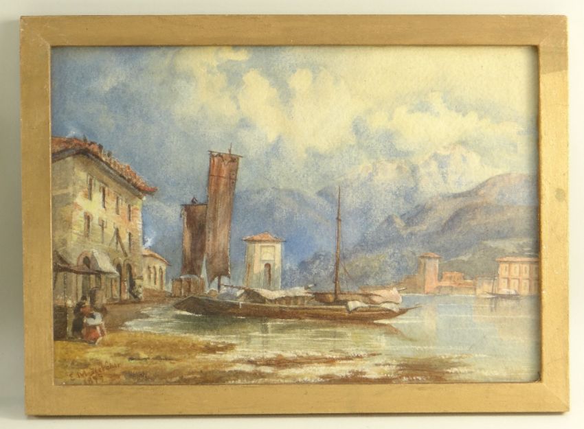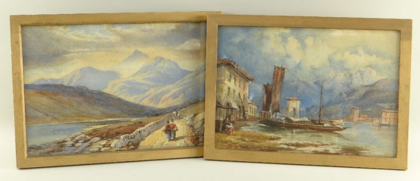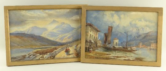 E.M. FLETCHER pair watercolours - Snowdonia landscape with Welsh figures in costume, and Italian lake landscape, one signed and dated 1899, 21.5 x 31cms (2)