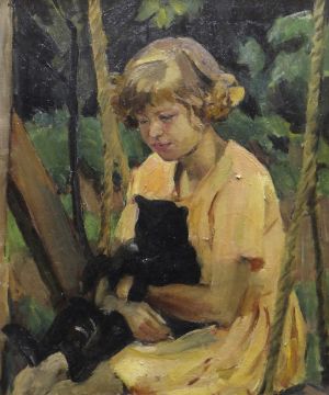 EVAN WALTERS oil on canvas - three-quarters portrait of a young girl seated in a swing with black cat, signed and dated 1922, 74 x 61cms