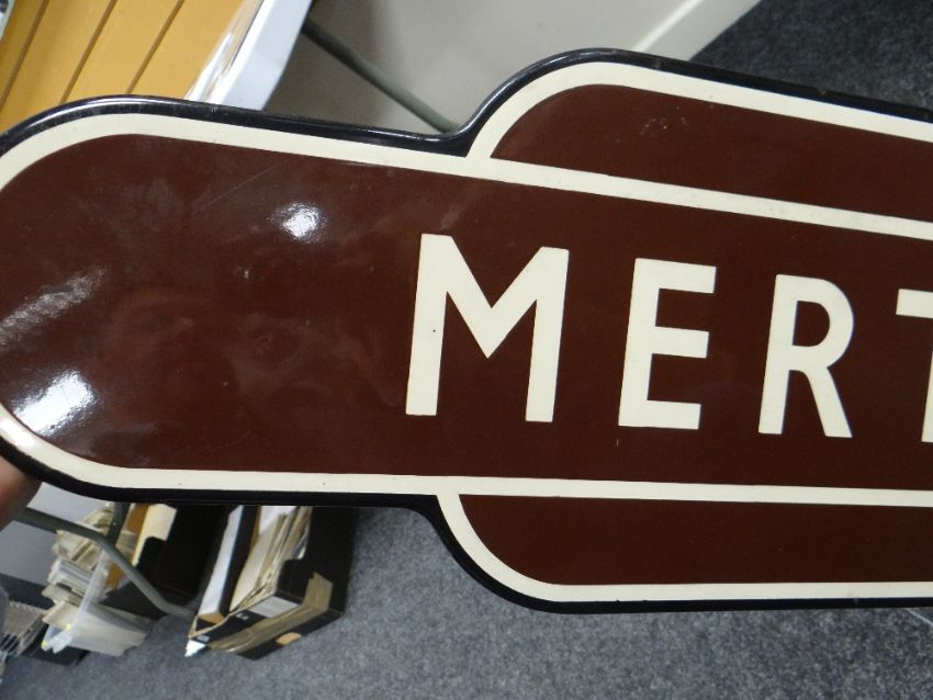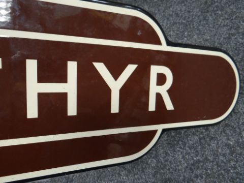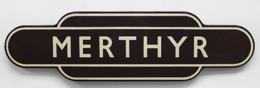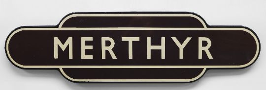 A BRITISH RAIL'TOTEM' ENAMEL SIGN FOR MERTHYR TYDFIL in typical brown, cream and black livery, of rounded-edge form, 93cms long