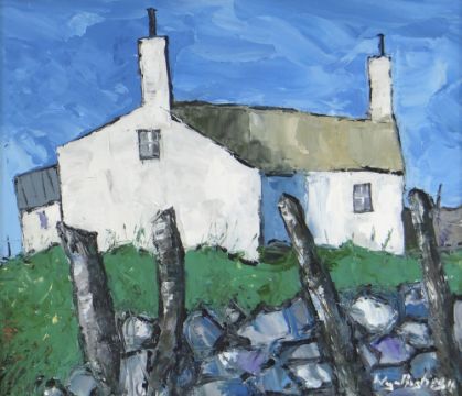 WYN HUGHES acrylic - whitewashed cottage with blue sky, signed, 21 x 24cms