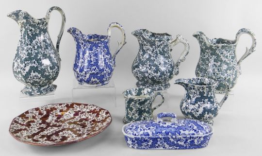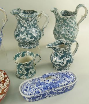 EIGHT YNYSMEUDWY POTTERY ITEMS IN MATCHING 'FLORAL 1' TRANSFER comprising four jugs and a single tankard, decorated in the green version of the sheet-pattern with repeated lichen interspersed with chickweed, together with a similar blue transfer jug, blue toothbrush container and unusual copper lustre plate in the same pattern, tallest jug 24.5cms high