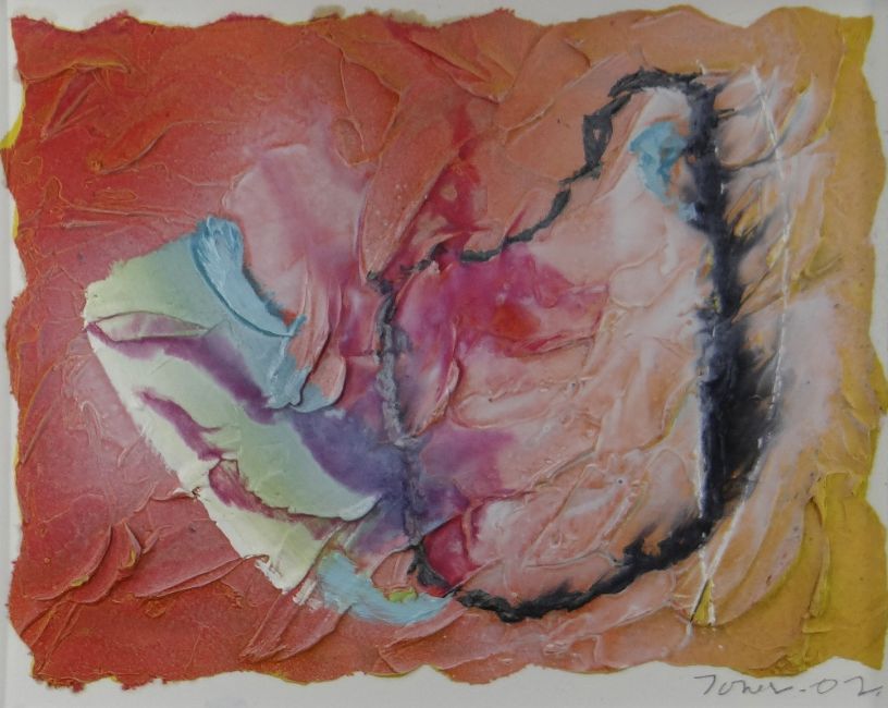 MARTYN DALLIMORE JONES impasto oil on card - abstract, entitled verso 'Aureolin Sugar Plum', signed and dated '02, 35 x 44cms