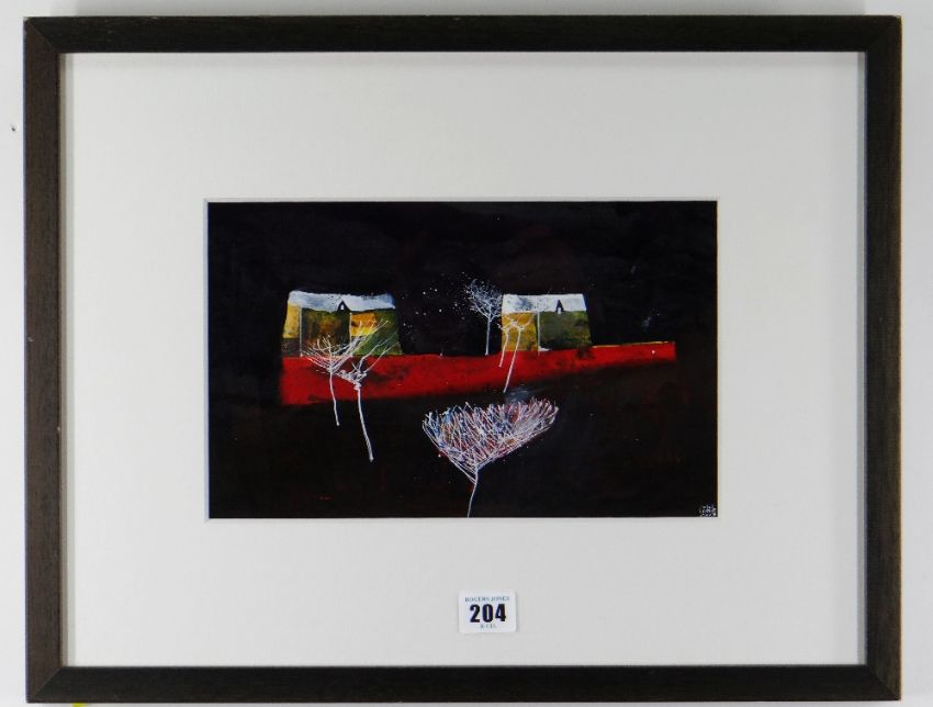 DEWI TUDUR mixed media - two buildings and trees, black night, signed and dated 2013, 17 x 27cms