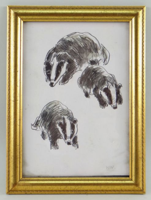 SIR KYFFIN WILLIAMS RA three signed prints - (1) ponies grazing, (2) three stalking badgers and (3) alert sheep dog, all signed with initials, all 20 x 14cms (3)