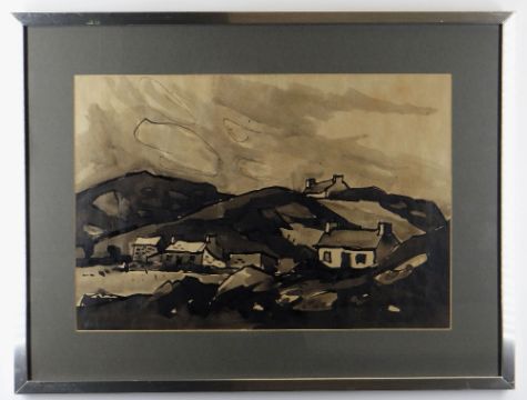 SIR KYFFIN WILLIAMS RA inkwash - landscape with houses, signed with initials in pencil, circa 1980, 29 x 43cms