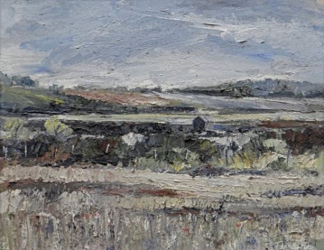 JOHN KNAPP-FISHER oil on board - stormy landscape with barn, signed, 39 x 49cms