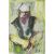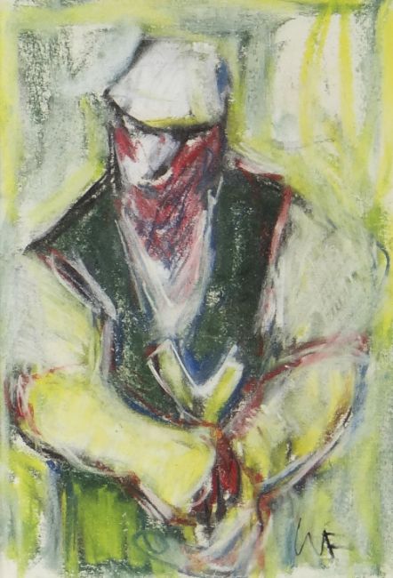 WILL ROBERTS mixed media - waistcoat and cap wearing figure with thumb-stick walking-stick, signed with initials, 29 x 19cms
