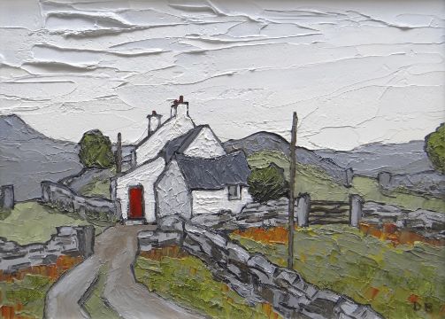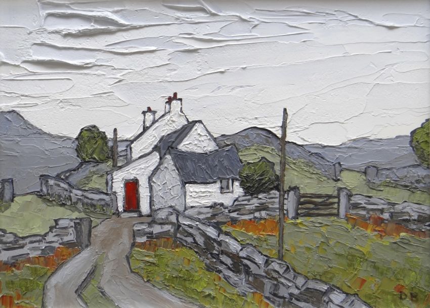 DAVID BARNES oil on board - whitewashed cottage with red door in landscape, signed with initials and fully verso, 28.5 x 37cms