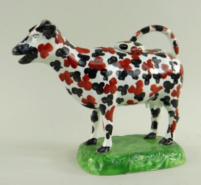 A SWANSEA CAMBRIAN PEARLWARE COW CREAMER typically modelled with tail loop-handle and standing on a rectangular green washed base, the body painted with black and iron red markings, 14cms high