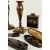 GROUP OF INTERESTING JAPANNED TÔLE WARE CURIOS BELIEVED PONTYPOOL OR USK comprising (1)pair of candlesticks of baluster form on square bases, floral decorated, 21cms high (2) rectangular based tea canister with tortoise-shell effect reserve with opposing oval cartouches of finely painted landscape scenes, 8.5cms (3) a rare Winsor & Newton miniature en plein air paints-locket with finger-ring and neck-ribbon for practical use (4) cased pocket balance (5) spectacles case with faux tortoise-shell spectacles and (6) a pair of tongs