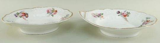 A PAIR OF NANTGARW PORCELAIN SHELL HANDLED DISHES of lobed form, having moulded handle and borders of c-scrolls, flowers and ribbons, both painted with sprays of flowers and foliage within solid gilt line borders, one impressed NANT GARW CW to base, 23cms