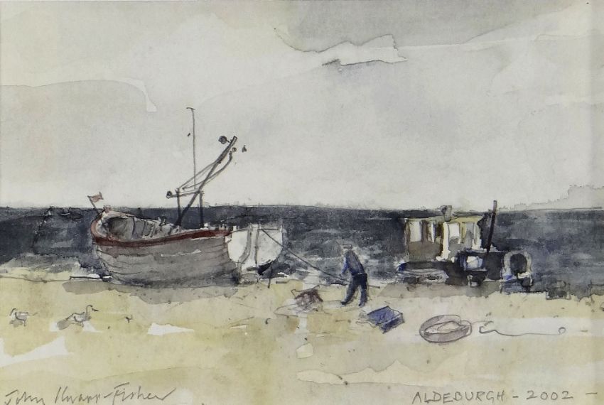 JOHN KNAPP-FISHER pencil and watercolour - beach scene with figure and two boats, titled Aldeburgh 2002, personal message verso, signed, 12.5 x 18cms