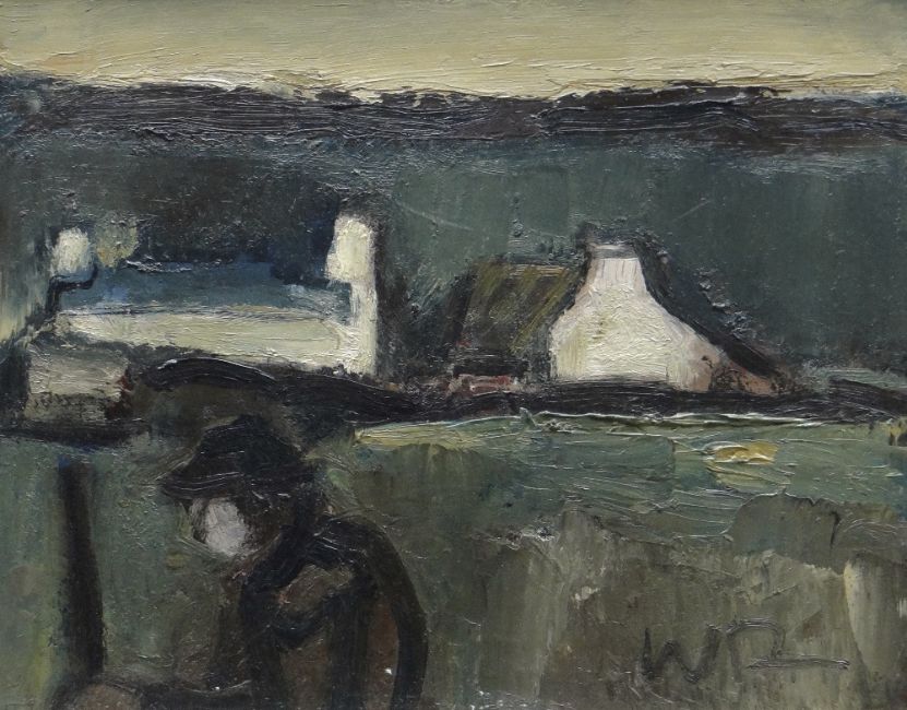 WILL ROBERTS oil on board - figure with hand-tool and farm, entitled verso 'Landscape with Figure, 1974', signed with initials, 19 x 24cms