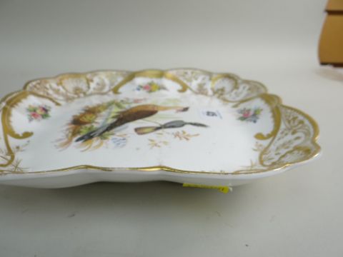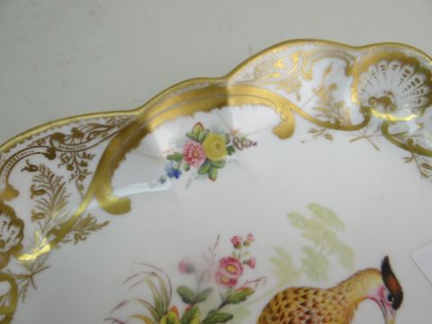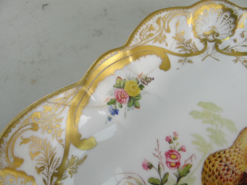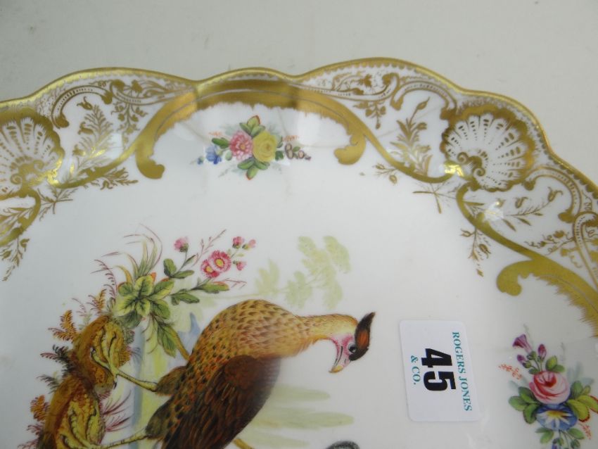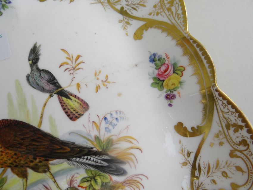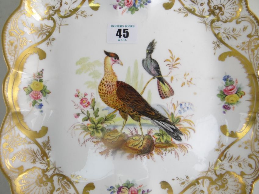 A NANTGARW PORCELAIN SQUARE DISH FROM THE MACKINTOSH SERVICE having a shaped rim, painted in London, probably by Thomas Martin Randall, with a fine standing bird and a smaller perched bird set amongst grasses and flowering plants, the gilded shell and scroll border reserving floral sprays, impressed NANT GARW CW to base, 24 x 24cms