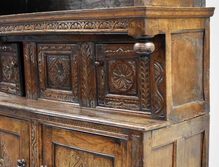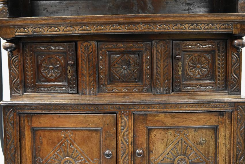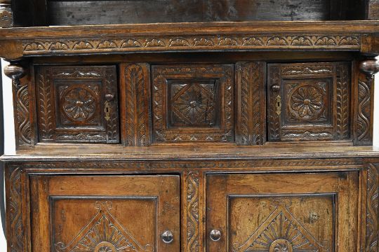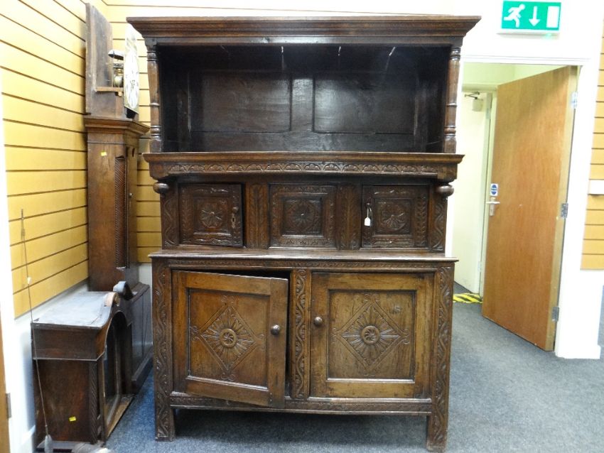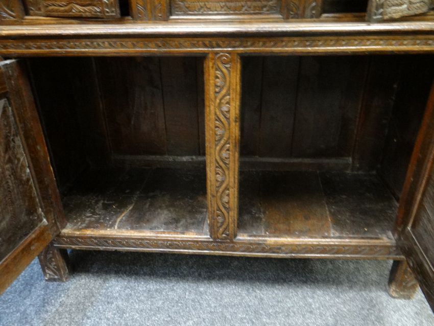 EARLY EIGHTEENTH CENTURY & LATER SNOWDONIA CWPWRDD TRIDARN in carved oak, having an open canopy, turned pendants, middle section with double cupboard and fixed central panel, base with two panelled cupboards, all over geometric and foliate carving, on stile feet, one support carved with the letters 'OT', 143cms wide x 188cms high