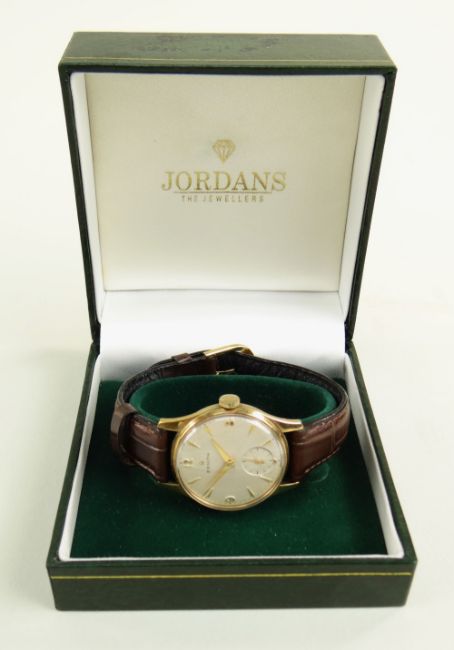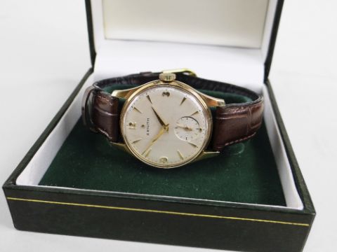 ZENITH GENT'S 9CT GOLD WRISTWATCH having subsidiary seconds dial, dagger hour markers, Arabic numerals at 3, 9 and 12. Hallmarked to the inner back cover and numbered 311 with 17 jewel movement, associated strap and box Provenance: deceased estate, consigned via our Carmarthen office Condition Report: Appears in good overall condition with no obvious or significant damage or losses. Minor surface wear and scratches. Seconds hand is ticking.There is no star on the crown head.Possible replacement.