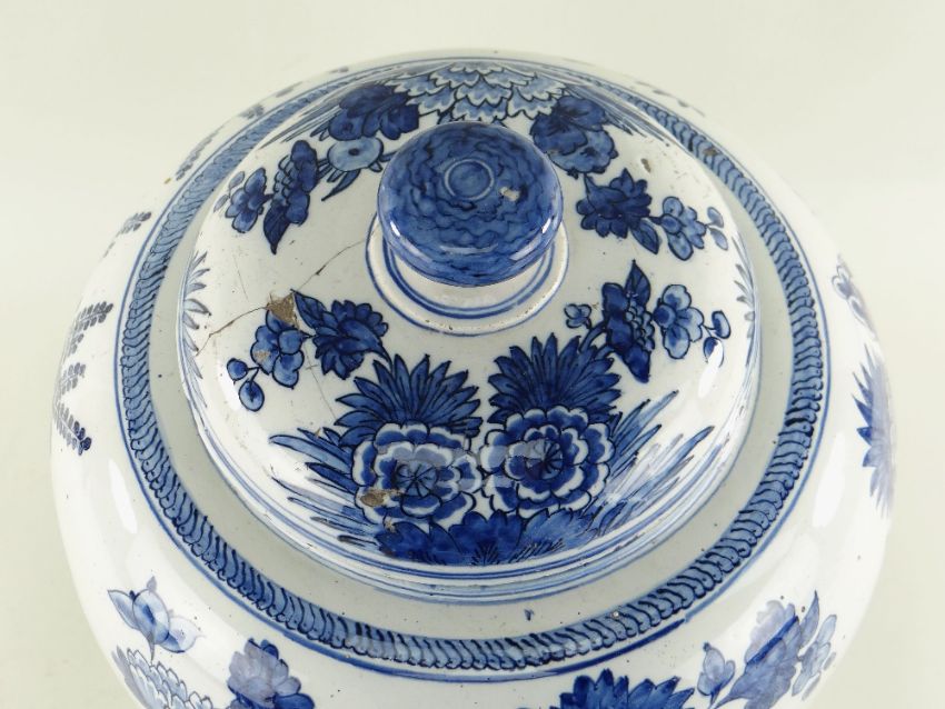 Condition Report: cover broken and reglued, restored rim, glaze chips; vase neck chipped all around and reduced slightly, chips to foot.
