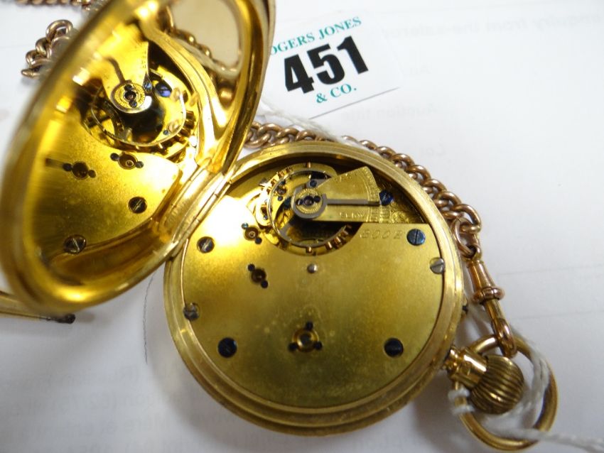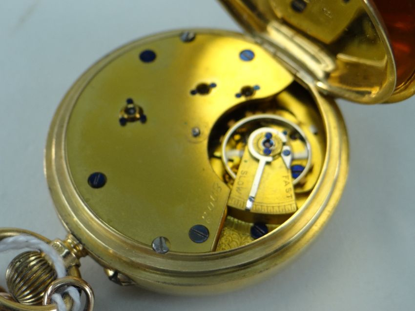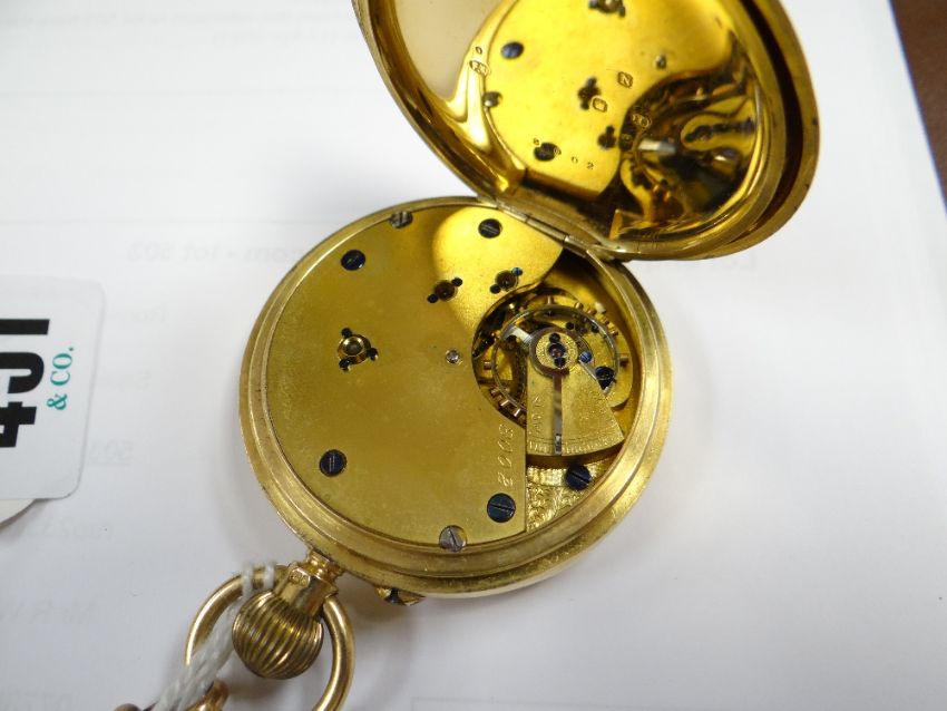 18CT GOLD OPEN FACED POCKET WATCH having enamel dial with Roman numeral chapter ring and subsidiary seconds dial, the back cover engraved, the movement plate numbered 8002 with 9ct gold Albert chain with 'T' bar and Wahl Eversharp gold filled pencil, 149.5gms overall (not including pencil) Provenance: deceased estate Swansea Condition Report: seconds hand ticking, some minor hairline cracks to dial, surface wear and light scratchesThe case diameter is 50mmThe gross weight without chain is 105grams.The chain looks good, all links hallmarked.Weight of chain without pencil is 44grams