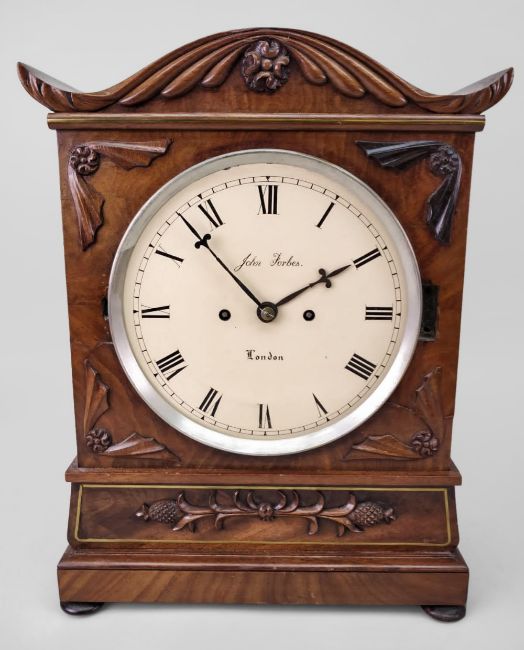 WILLIAM IV WALNUT & BRASS STRUNG BRACKET CLOCK, circular painted roman dial inscribed 'John Forbes, London', unsigned twin fusee eight day striking movement, within carved and applied spandrels below a conforming carved pagoda style top, later glass rectangular side panels, on a carved ogee shaped base, plinth and bun feet, 41cms high x 31cms wide.