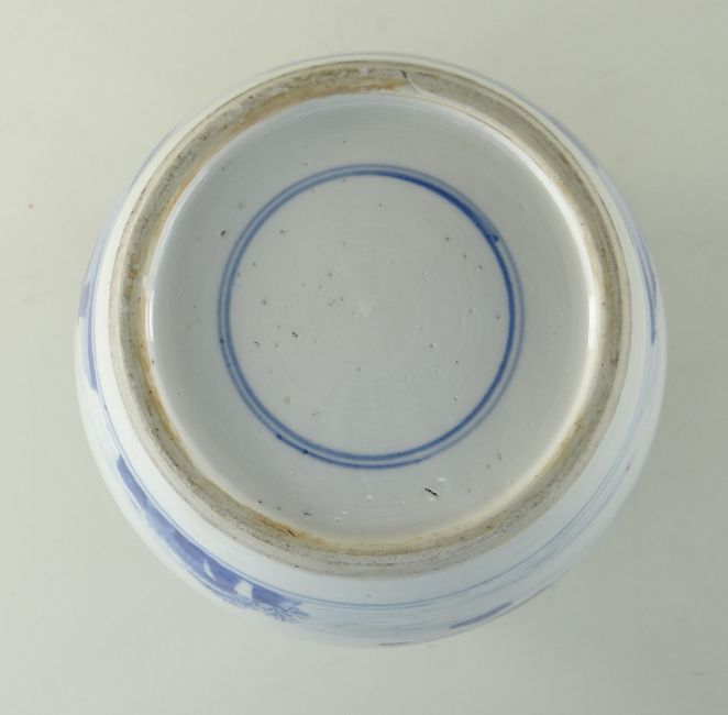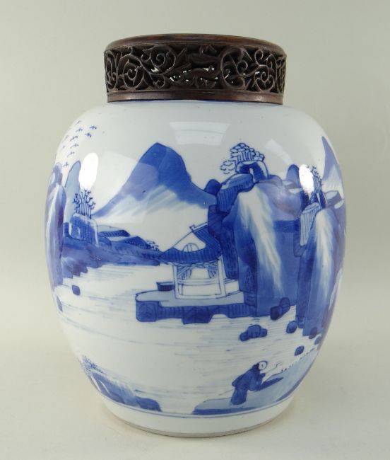 CHINESE BLUE & WHITE PORCELAIN 'SCHOLARS AND LANDSCAPE' JAR, Kangxi, of ovoid form, painted with a broad continuous frieze depicting two figures in an extensive mountainous landscape with river and pavilions, cloud collar to the shoulder, base with double circle, later pierced hardwood cover, 22cm high, 25cm with cover