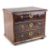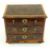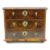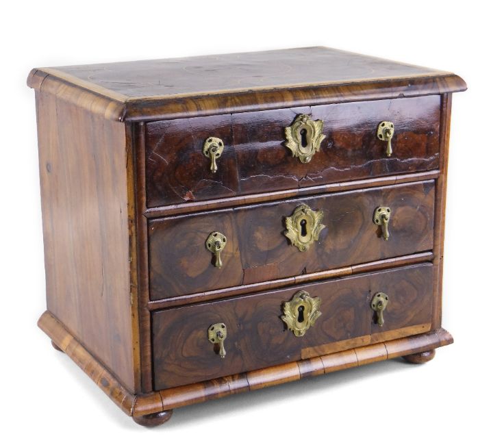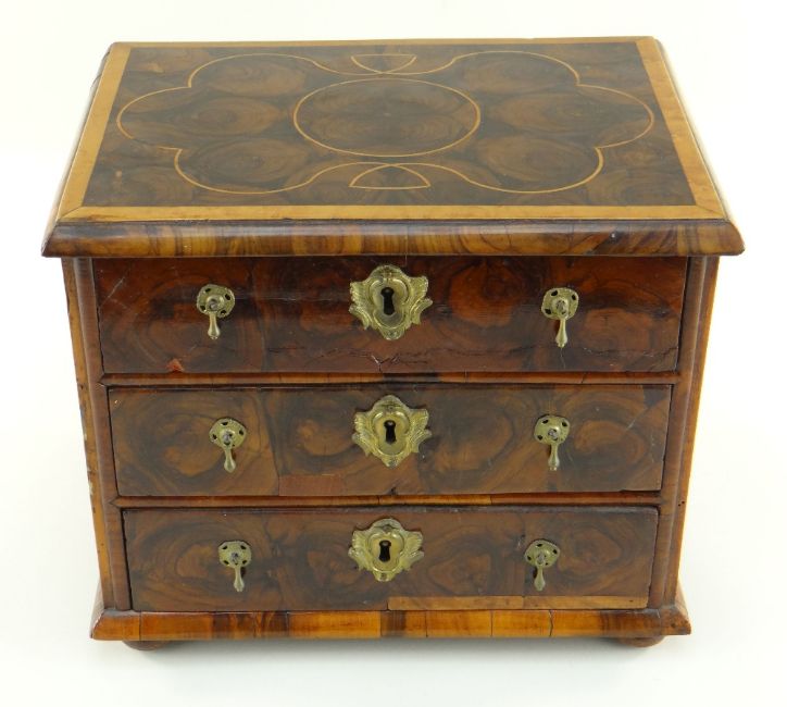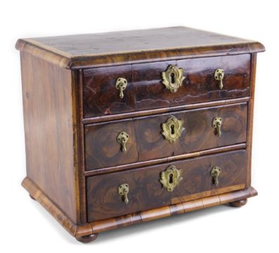 WILLIAM & MARY STYLE OYSTER VENEERED MINIATURE CHEST, parts possibly late 17th Century, rectangular moulded top inlaid with sycamore crossbanding and curvilinear motif, above three long drawers, on bun feet, later brass escutcheon and drop baluster handles, 31 x 22 x 27cms