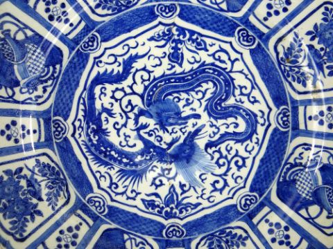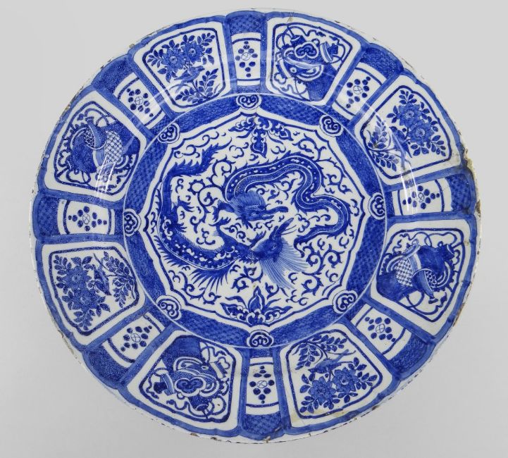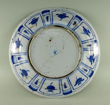 Auctioneer's Notes: Delft chargers in the Oriental style were copied from Arita versions imported by the Dutch East India Company (VOC) in the 17th Century. Arita potters copied the Chinese chargers of the Wanli period.