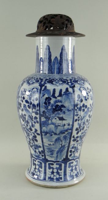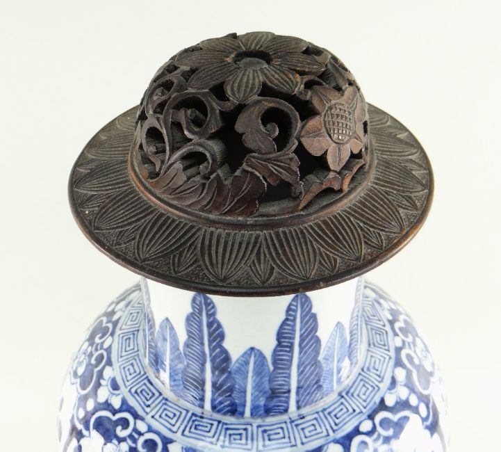 CHINESE BLUE & WHITE PORCELAIN BALUSTER VASE, 19th Century, painted with alternate panels of river landscapes and with songbirds in flowering shrubs, between key fret, cloud-collar and lappet borders, tall neck with stiff leaves, later carved wood cover, 39cms high, 46cms with cover