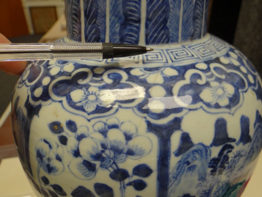 Condition Report: large crack to body, a few tiny iron oxide bleeds, later cover which lacks knop.