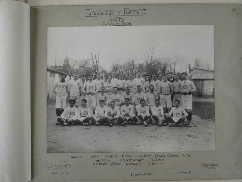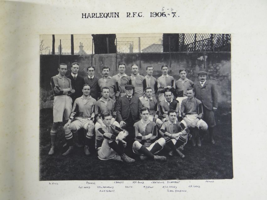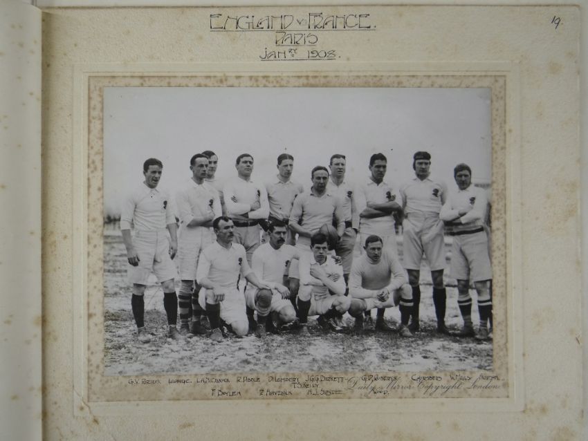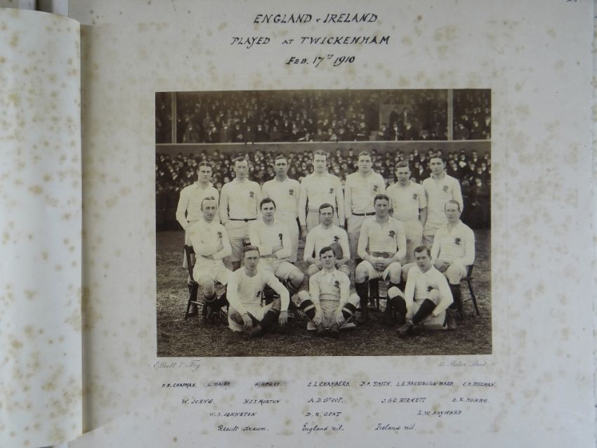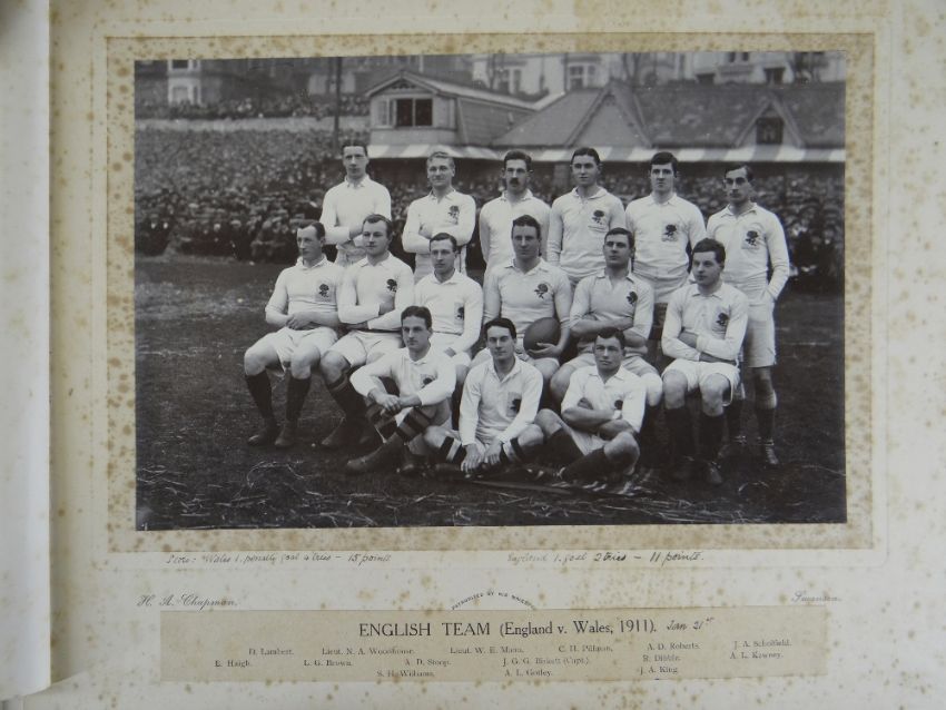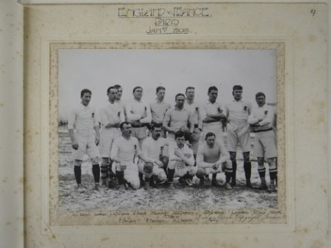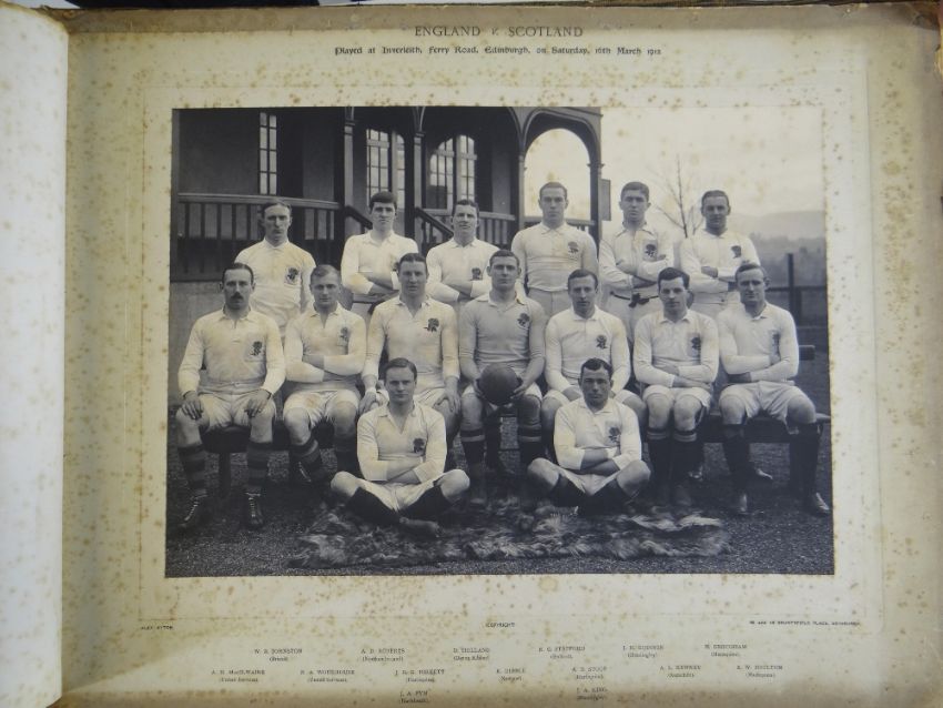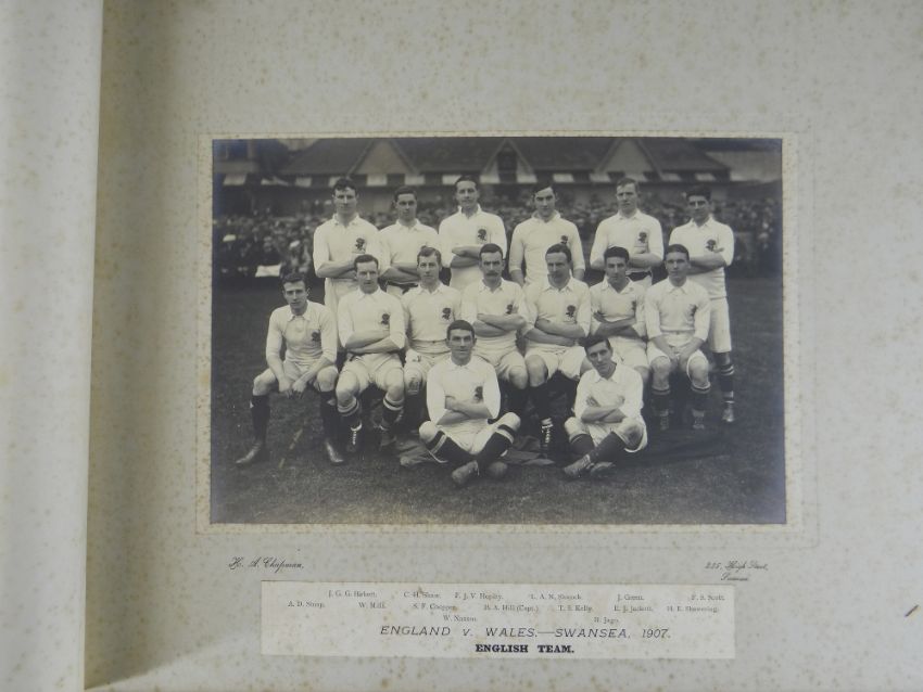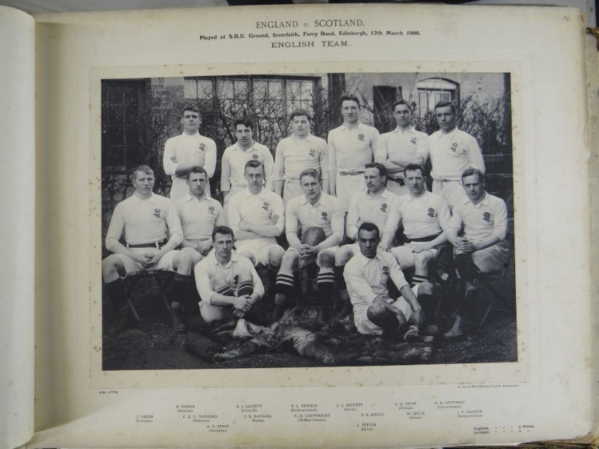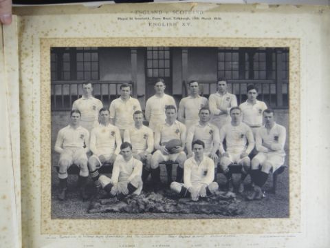 A COMPREHENSIVE PHOTOGRAPH ALBUM RELATING TO THE RUGBY UNION CAREER OF JOHN GUY GILBERNE BIRKETT (1884-1967) including official England International Rugby Union team photographs, school and club photographs, 1900 through to 1912 Almost all photographs laid to traditional presentation boards, team members printed or handwritten. Also present are newspaper cuttings, telegrams and menu cards, there are 44 team photographs with 20 being official England team photographs, main items listed as follows:1. Team photo Colvin House, Haileybury College 19002. Ditto (Cock-House) 19023. Haileybury College XV 19024. Unknown signed ‘Menu Card’5. Stade Francais v Brighton match report6. Brighton Football Club 1903-47. Ditto 1904-58. Barbarians 1907-79. Ditto 1908-910. Harlequin RFC 1906-7 (corrected to 1905-6)11. England v Scotland 1906 (J G G Birkett’s debut)12. England v France (Paris) 1906 (small)13. England v South Africa 190614. Rugby Football Union Dinner to the South African Team 190615. Harlequins FC 1906-7 (2 x) 16. England v France 190717. England v Wales 190718. England v Scotland 190719. Harlequins RFC 1907-820. England v France 190821. England v Wales 190822. England v Ireland 190823. England v Scotland 190824. Harlequins RFC 1909-1025. RFU England v Wales 191026. England v Ireland 191027. England v Scotland 191028. Harlequins RFC 1910-1129. Harlequins untitled with 6 x players30. England v Wales 1911 (with telegram to family and cuttings)31. England v France 1911 (with cuttings) 32. Menu card for Ireland v England 1911, six signatures33. England v Ireland 1911 (with telegram to family)34. England v Scotland 191135. Harlequins RFC 1911-1236. England v Wales 191237. England v Ireland 191238. England v Scotland 191239. England v France 191240. Harlequins 1919-2041. Harlequins Past v Harlequins Present (undated)42. Old Cocks v Eton CollegePlease see Lots 574 for more information of J G G Birkett. Please note the heavy weight of this item.Provenance: the vendors of the Birkett Sporting Archive are the great grandsons of J G G Birkett (1884-1967), and the great-great-grandsons of Reg BirkettSee our digital catalogue for this collection with further images here https://bit.ly/2PixOMn