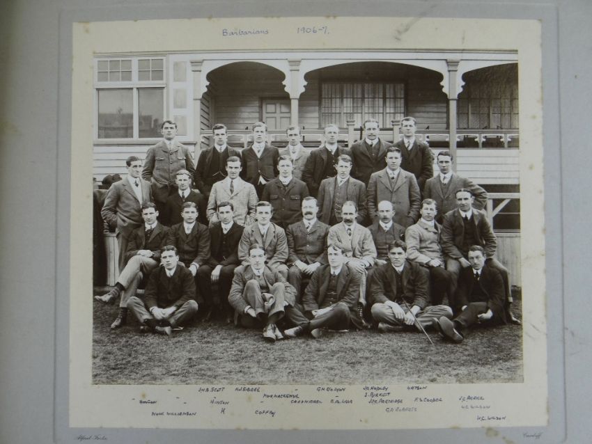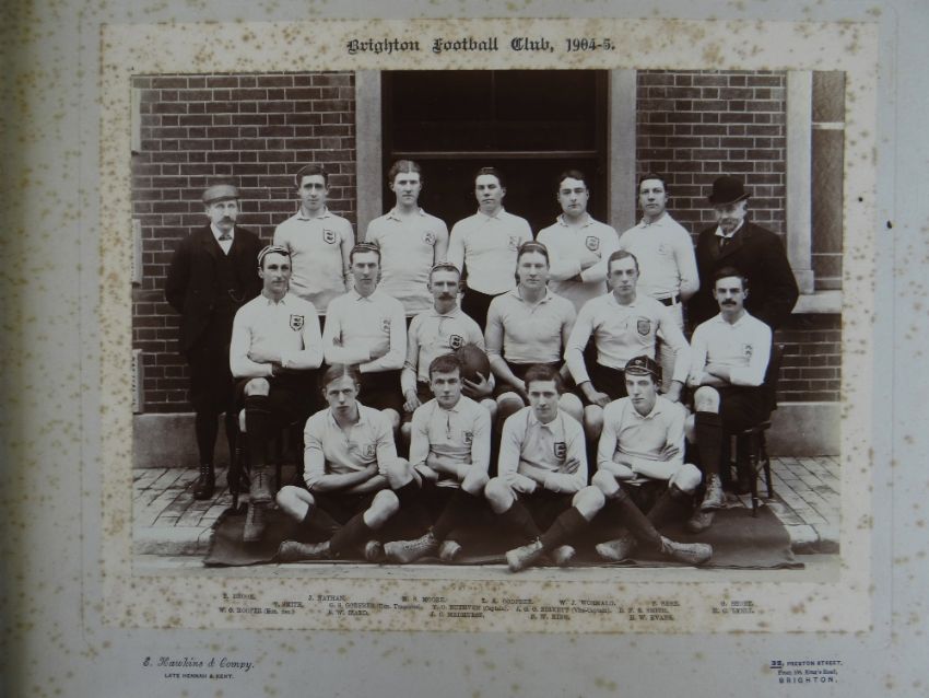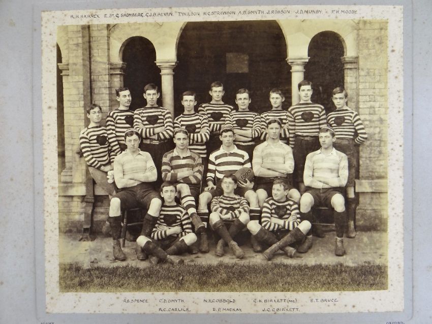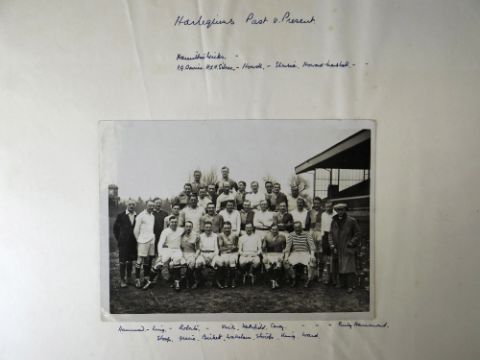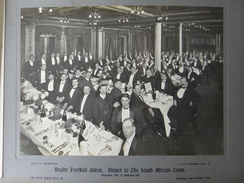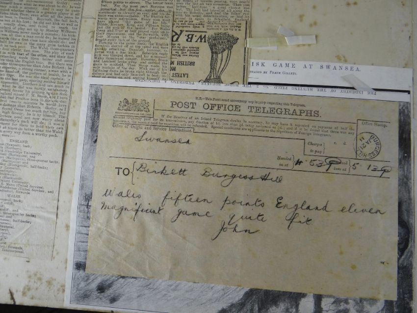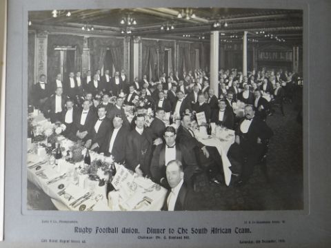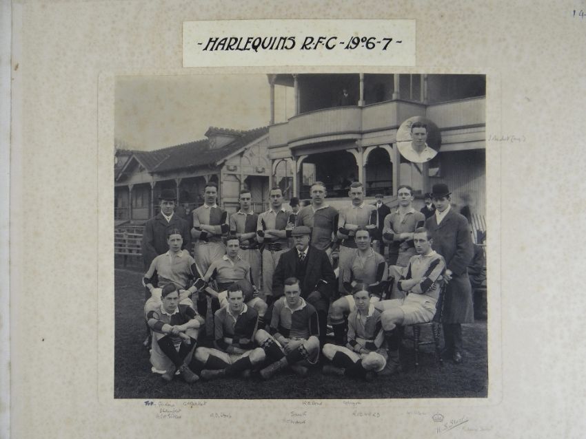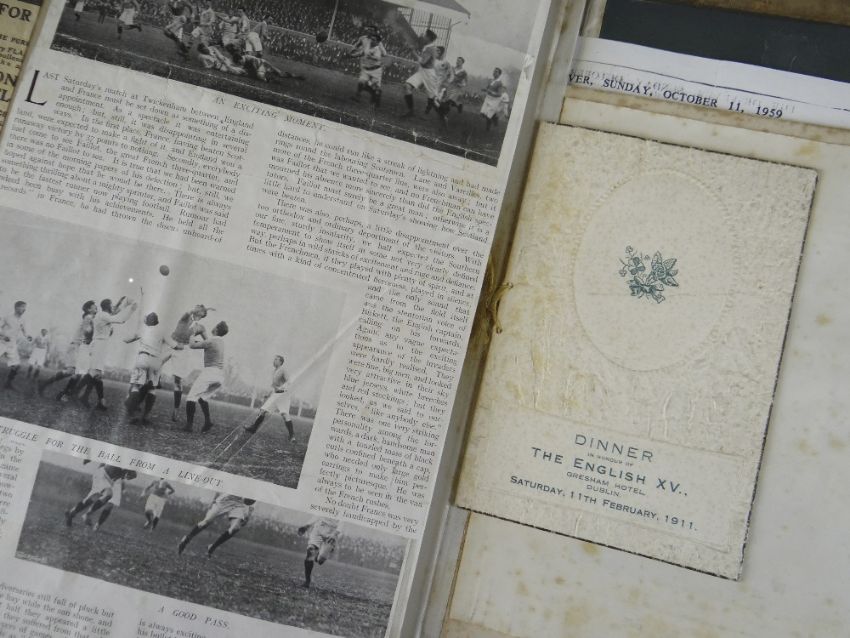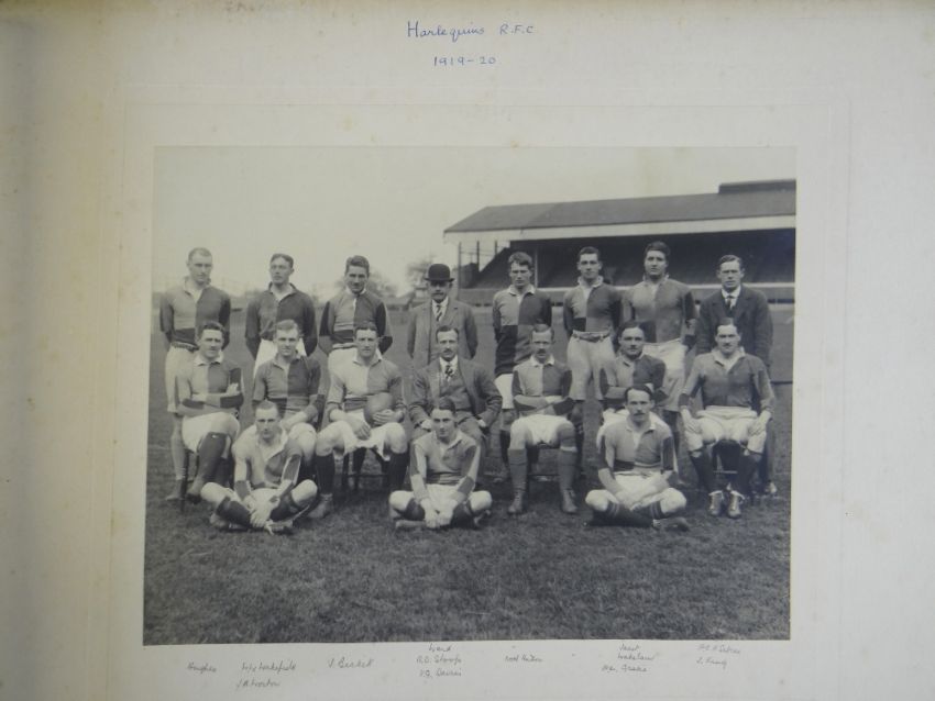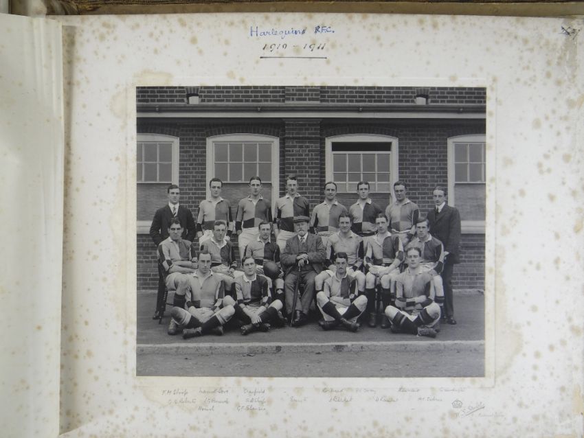 A COMPREHENSIVE PHOTOGRAPH ALBUM RELATING TO THE RUGBY UNION CAREER OF JOHN GUY GILBERNE BIRKETT (1884-1967) including official England International Rugby Union team photographs, school and club photographs, 1900 through to 1912 Almost all photographs laid to traditional presentation boards, team members printed or handwritten. Also present are newspaper cuttings, telegrams and menu cards, there are 44 team photographs with 20 being official England team photographs, main items listed as follows:1. Team photo Colvin House, Haileybury College 19002. Ditto (Cock-House) 19023. Haileybury College XV 19024. Unknown signed ‘Menu Card’5. Stade Francais v Brighton match report6. Brighton Football Club 1903-47. Ditto 1904-58. Barbarians 1907-79. Ditto 1908-910. Harlequin RFC 1906-7 (corrected to 1905-6)11. England v Scotland 1906 (J G G Birkett’s debut)12. England v France (Paris) 1906 (small)13. England v South Africa 190614. Rugby Football Union Dinner to the South African Team 190615. Harlequins FC 1906-7 (2 x) 16. England v France 190717. England v Wales 190718. England v Scotland 190719. Harlequins RFC 1907-820. England v France 190821. England v Wales 190822. England v Ireland 190823. England v Scotland 190824. Harlequins RFC 1909-1025. RFU England v Wales 191026. England v Ireland 191027. England v Scotland 191028. Harlequins RFC 1910-1129. Harlequins untitled with 6 x players30. England v Wales 1911 (with telegram to family and cuttings)31. England v France 1911 (with cuttings) 32. Menu card for Ireland v England 1911, six signatures33. England v Ireland 1911 (with telegram to family)34. England v Scotland 191135. Harlequins RFC 1911-1236. England v Wales 191237. England v Ireland 191238. England v Scotland 191239. England v France 191240. Harlequins 1919-2041. Harlequins Past v Harlequins Present (undated)42. Old Cocks v Eton CollegePlease see Lots 574 for more information of J G G Birkett. Please note the heavy weight of this item.Provenance: the vendors of the Birkett Sporting Archive are the great grandsons of J G G Birkett (1884-1967), and the great-great-grandsons of Reg BirkettSee our digital catalogue for this collection with further images here https://bit.ly/2PixOMn