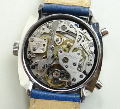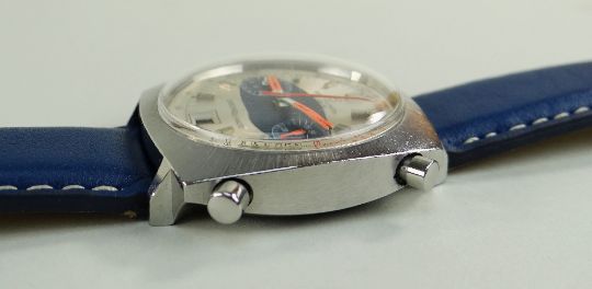 Condition Report: Case - wear commensurate with age, one pusher possibly replaced, Dial - hands marked, very small scratches and perimeter marks at 4,, Strap - new stitched leather.