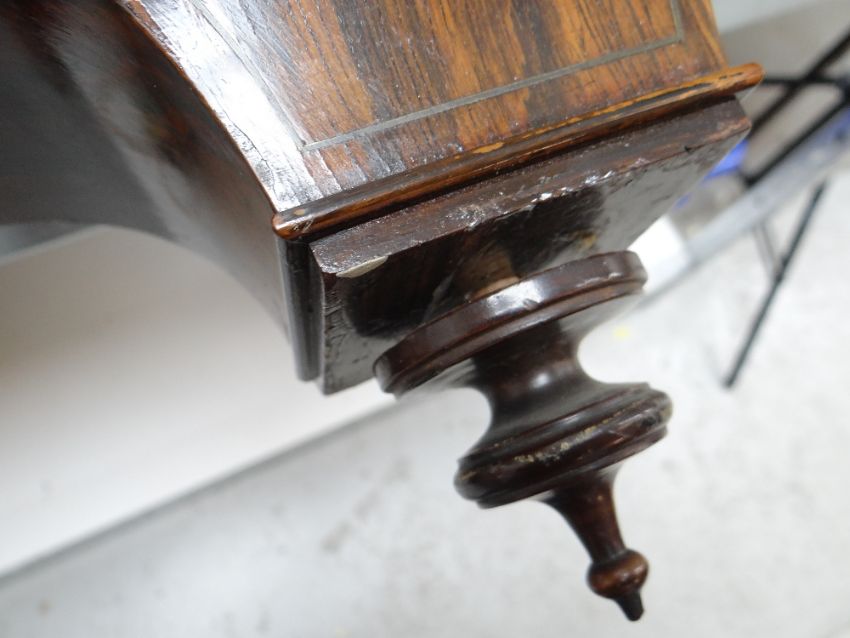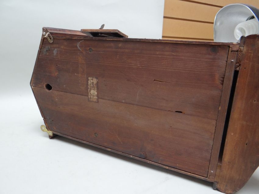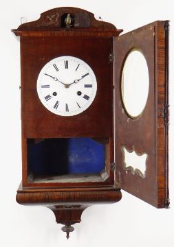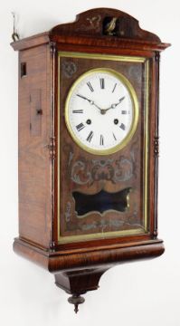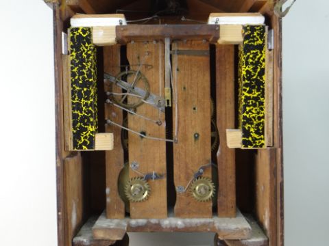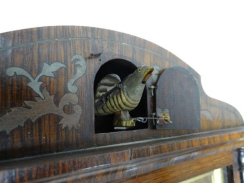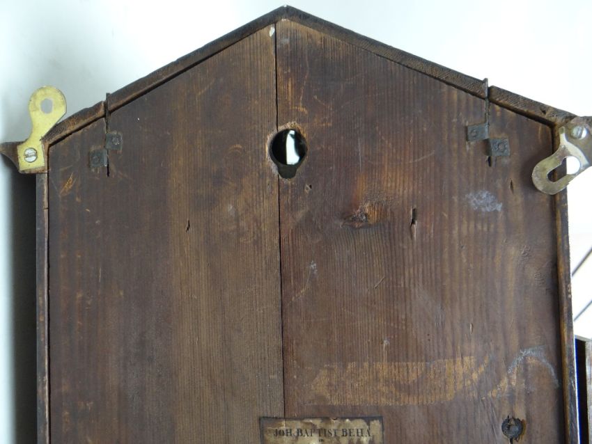 MID-19TH CENTURY GERMAN ROSEWOOD CUCKOO CLOCK, by Johann-Baptiste Beha, pewter and brass inlaid case in the Biedermeier style, arched top with centred door and painted cuckoo, tapering base, 6-inch Roman enamel dial, and double fusee movement with pine backplates, outside count-wheel striking a coiled gong, label to back, 66cms high Provenance: Deceased estate, South Wales. Condition Report: enamel to winding holds chipped, bellows restored, new pine blocks, case with minor scuffs, corners chipped veneerThe clock is not running.There is cracked glass on the bottom corner.There are enamel chips to the face and the brass surround is very loose.There is damage to the veneer, on most corners and is also bubbling in places.The bird door looks a little wornThere is mildew present at the bottom of the clock on the inside.