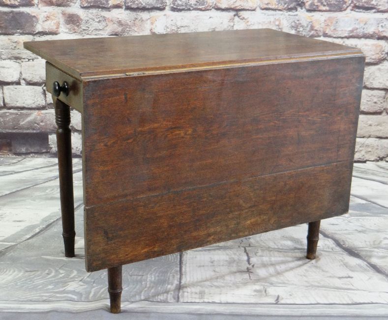 EARLY 19TH CENTURY OAK SINGLE DROP FLAP TABLE, end frieze drawer on ring turned legs, 109 x 97cms(extended) Condition Report: rule joint damaged, boards shrinkingThe height of the table is 76cm’s