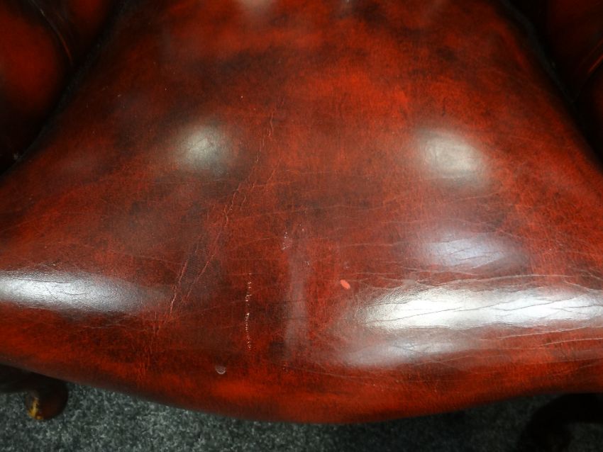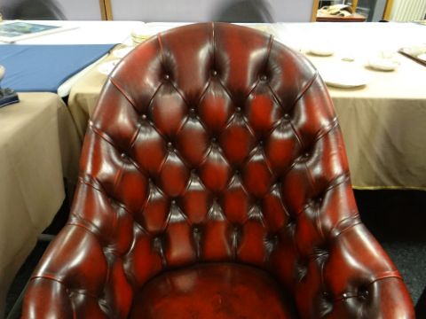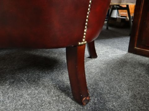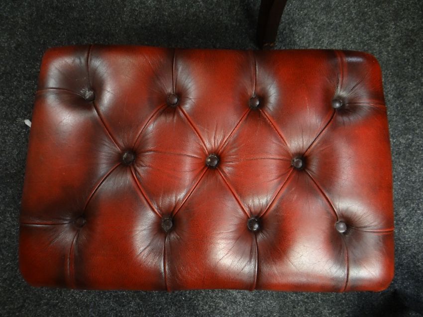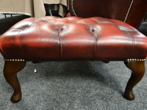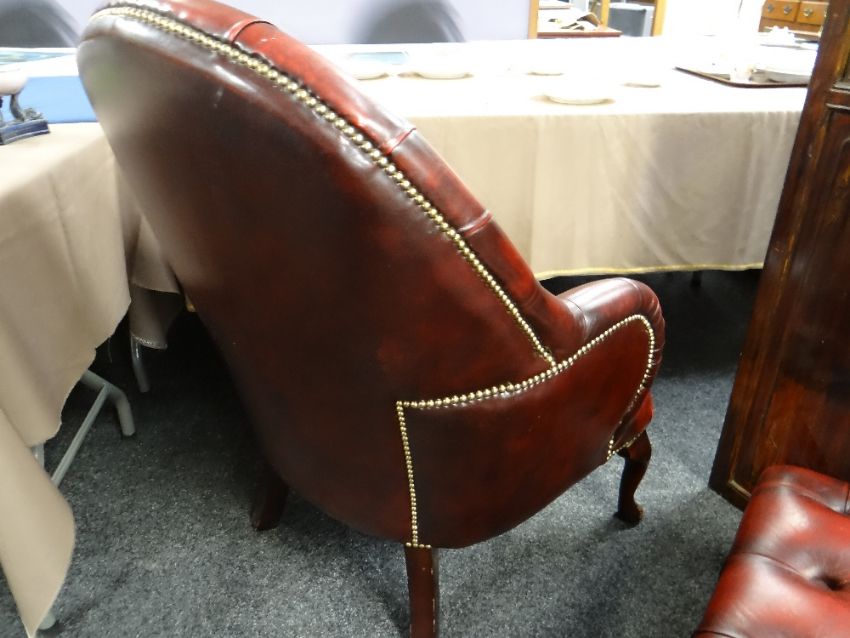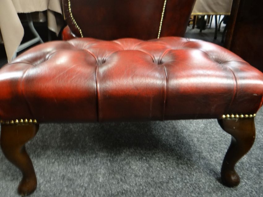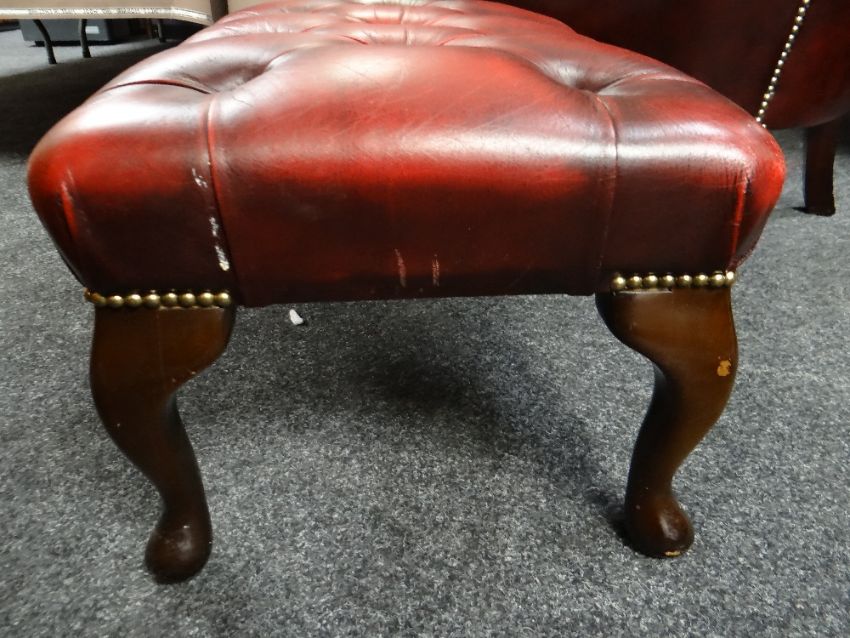 VICTORIAN-STYLE LEATHER SPOON BACK LIBRARY CHAIR & STOOL, red button upholstered and close nailed, serpentine seat, cabriole legs, 85cms high (2)