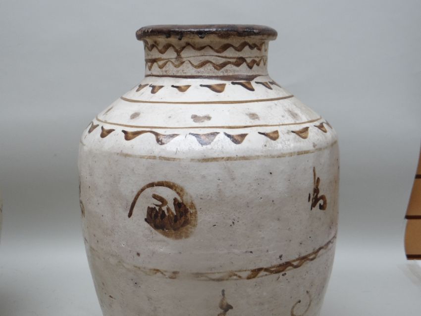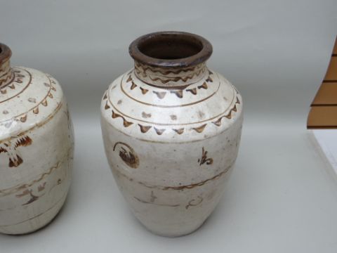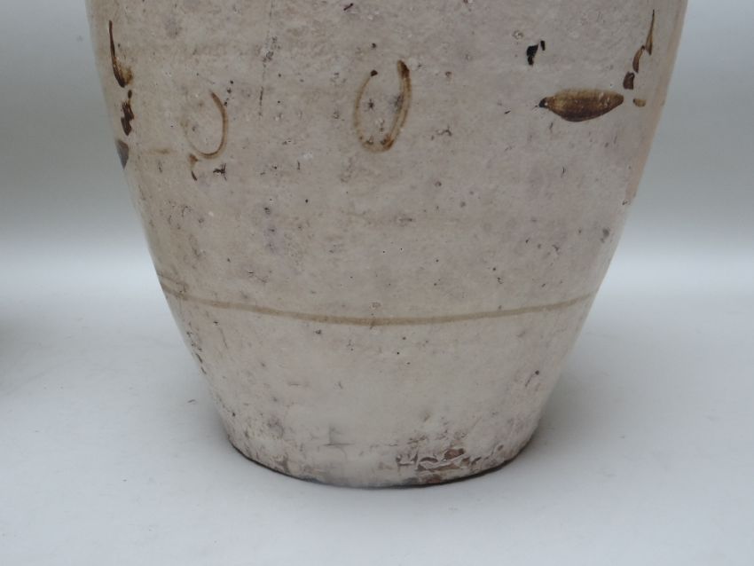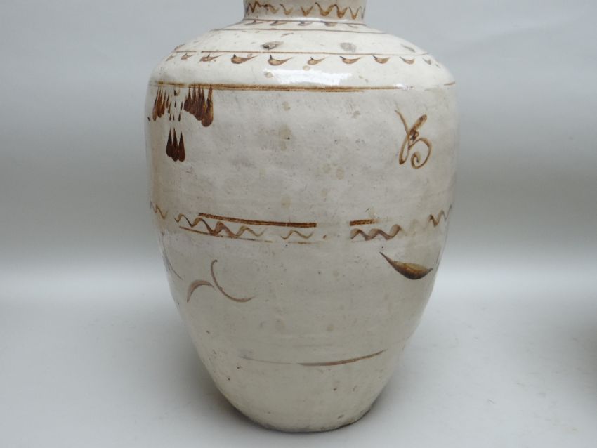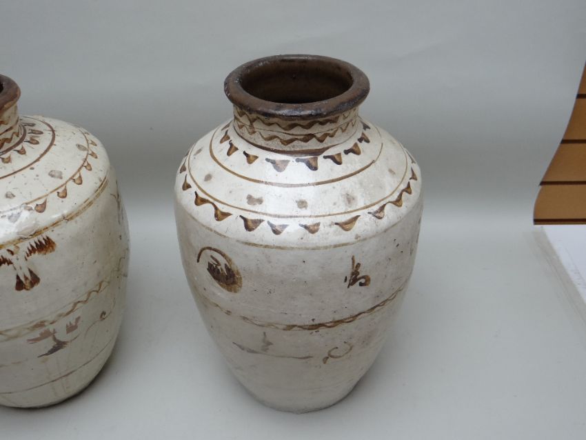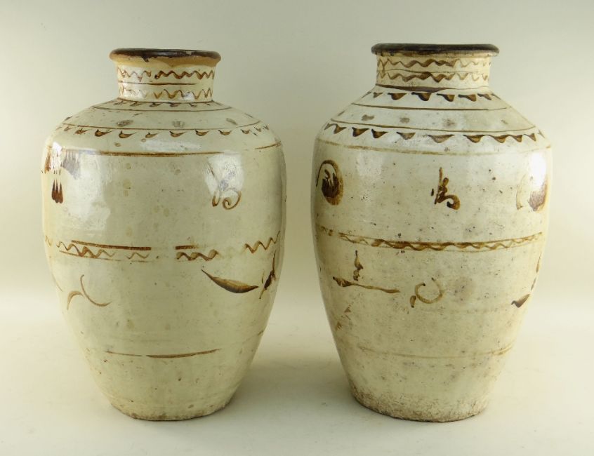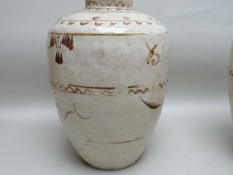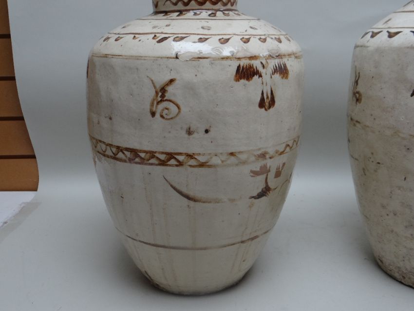 TWO CHINESE CIZHOU STONEWARE JARS, cream slip glazed with brown painted decoration, 50cms high (2)Lots of surface wear, glazing imperfections, small chips.Rim chips to both