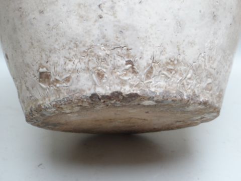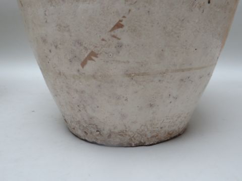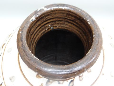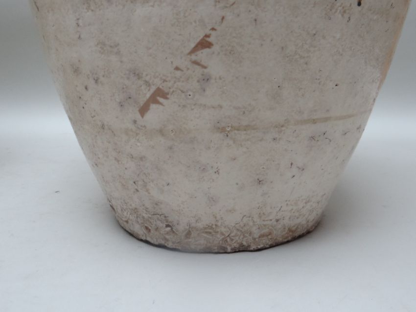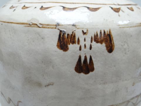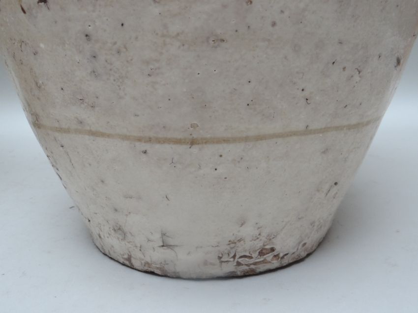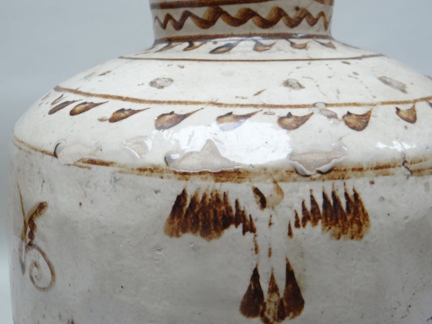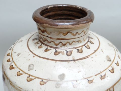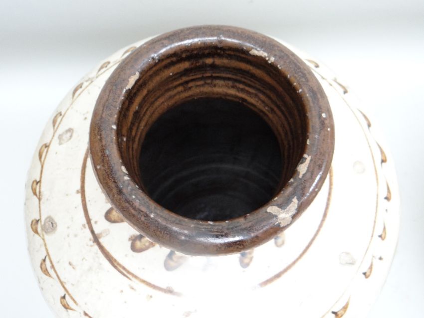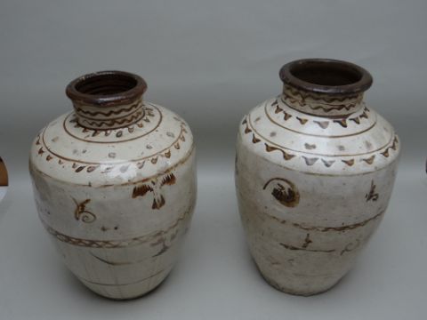 TWO CHINESE CIZHOU STONEWARE JARS, cream slip glazed with brown painted decoration, 50cms high (2)Lots of surface wear, glazing imperfections, small chips.Rim chips to both