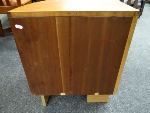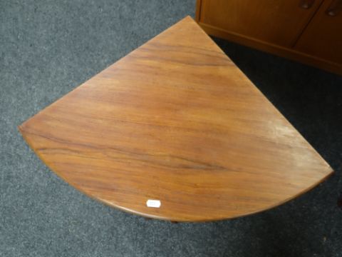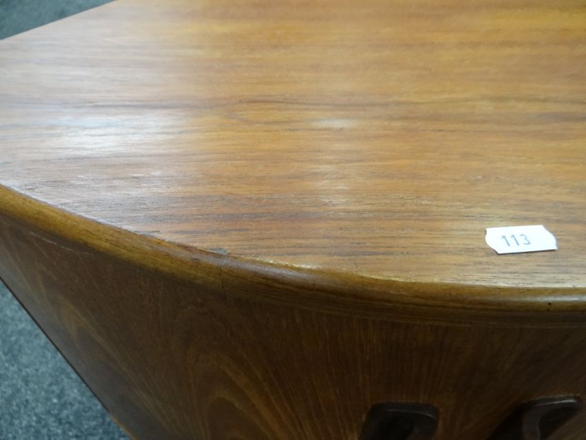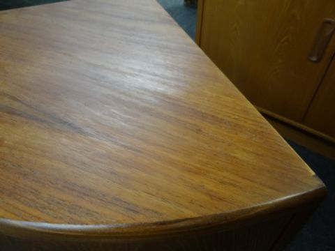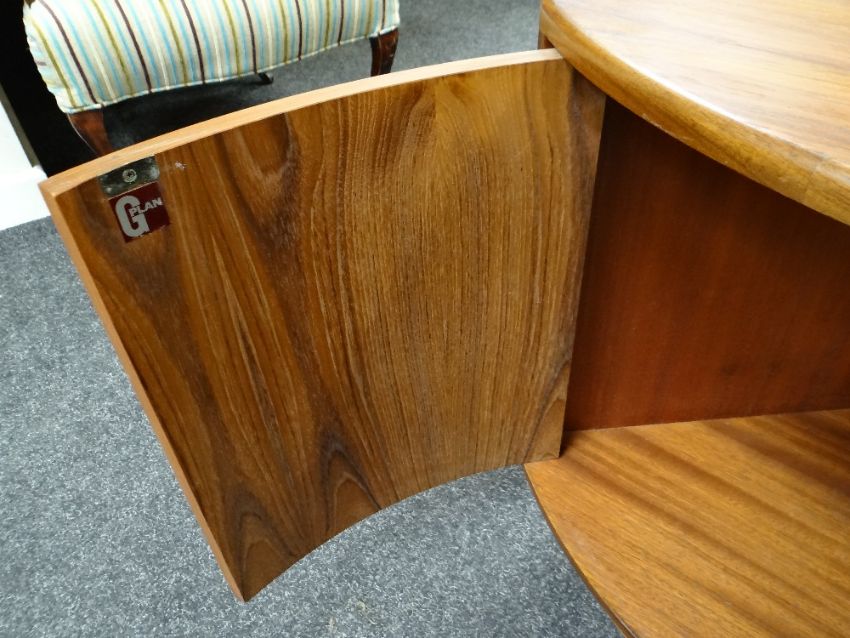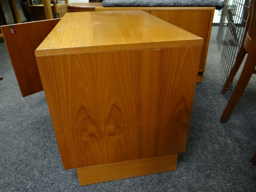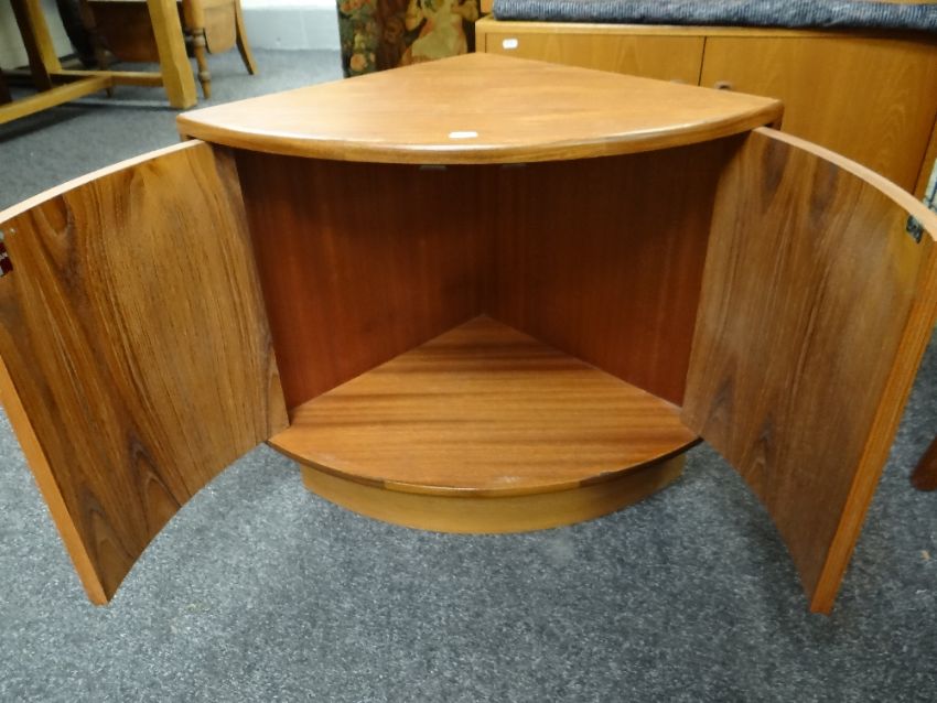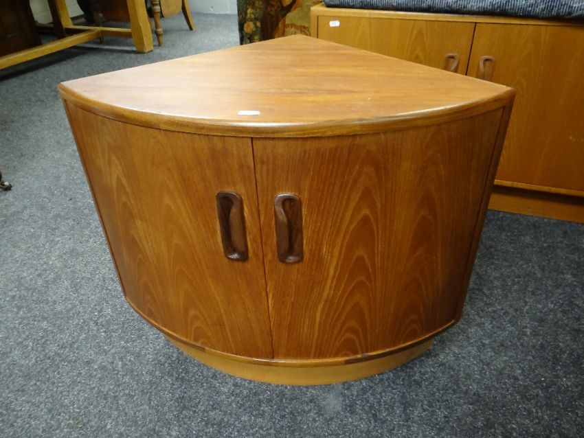 THREE G-PLAN TEAK LOW CUPBOARDS, including a pair of side cupboards 81cm wide, and a corner cupboards 64cms wide (3)The corner cabinet has fading on the top, some veneer loss on one corner and also in two places on the back.The pair just have light surface scratches, no other issues.