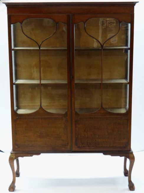 EDWARDIAN MAHOGANY DISPLAY CABINET, moulded top, whiplash astragal doors, glazed sides, claw and ball feet, 120 x 35 x 177cms