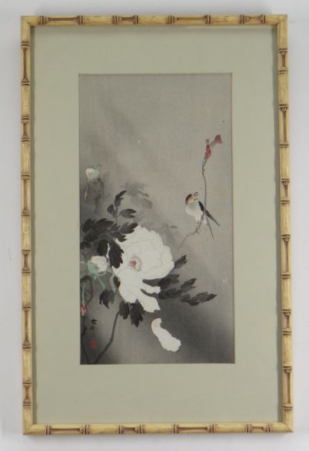 OHARA KOSON (1877-1945) ukiyo-e woodblock prints - sleeping ducks in moonlight, Cherry blossom in moonlight, Peony and songbird, 33.5 x 18cms (3)