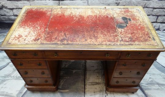 Condition Report: some drawer fronts warped, leather torn / stained, one drawer front corner restored veneer.