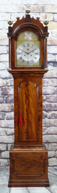 MAHOGANY 8-DAY LONGCASE CLOCK, c.1800, by Edward Appleford, Dunstable, 11-inch silvered dial signed in the arch, subsidiary seconds and calendar aperture, engraved centre, pierced brass spandrels, arched hood with fret cornice and ball finials, break arch door, rectangular base, five pillar movement striking a bell, 218cms high Condition Report: hour hand damaged, otherwise very good all round.The clock has a splits on both sides at the base