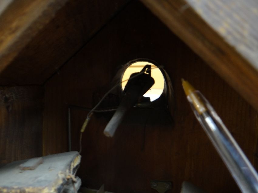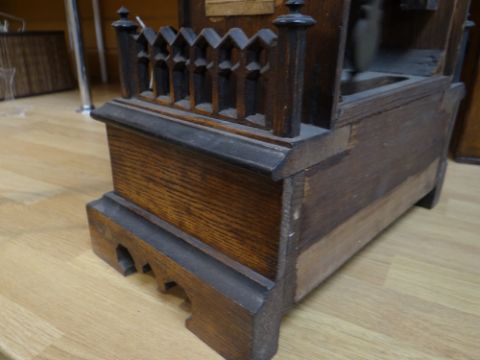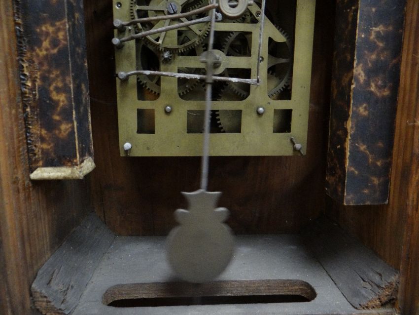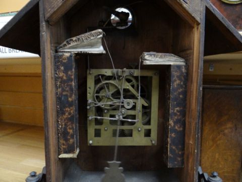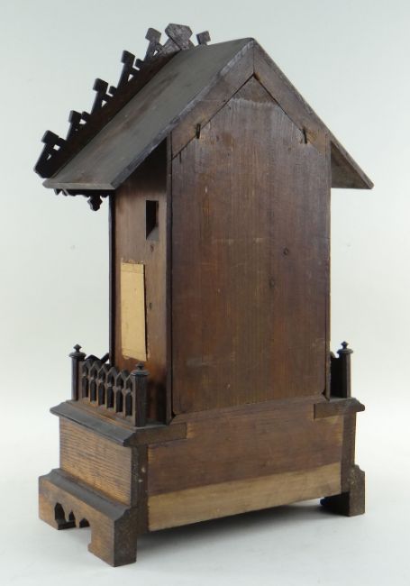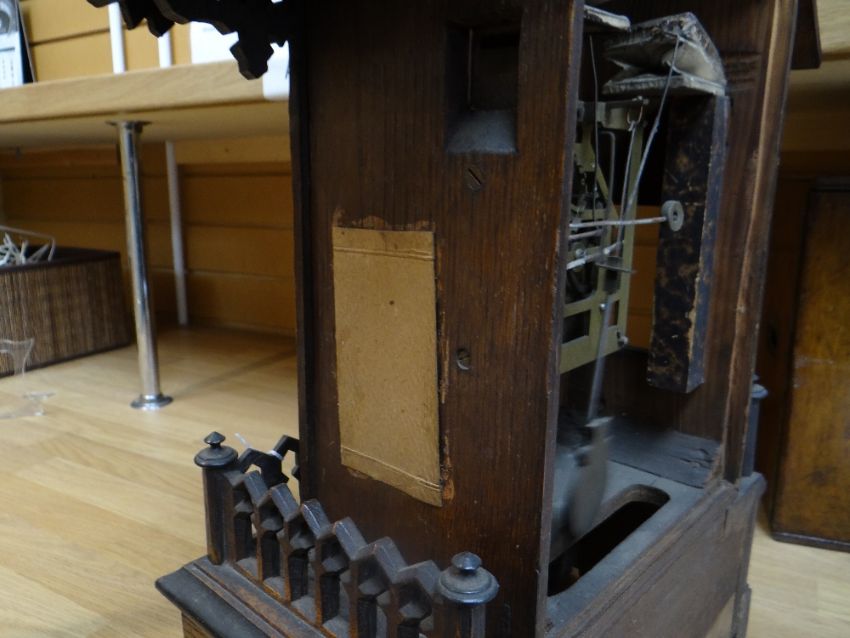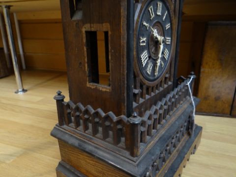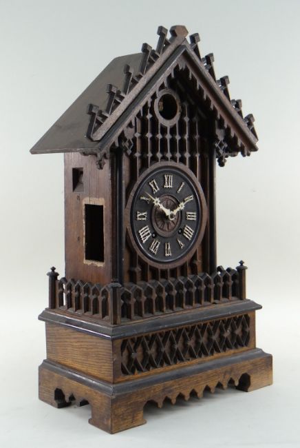 BLACK FOREST MANTEL CUCKOO CLOCK, of 'Chalet' form, with applied Roman numerals and bone hands, stained oak case, 54cms high Condition Report: side doors of cuckoo door missing, numeral X chipped, roof apex finial broken.The clock is not currently running, if you swing the pendulum most of the wheels and cogs inside move.The bellows when moved make the cuckoo noise and they both look good, no rips or tears.It looks like the cuckoo itself has come away from the mechanism, there is a wire that looks like it should be connected to the bird probably why it is not moving.The key is missing. The door to the bird is also missing.Most of the fret work on the outside looks good, two places have damage (see photographs) and the broken pieces are missing.One side panel is also missing.
