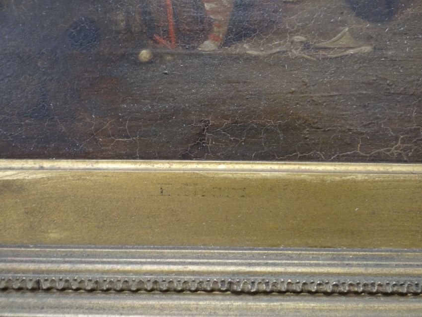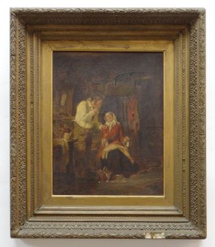 E. NICOT (19TH CENTURY) oil on canvas - A Stitch in Time, rustic couple in a cottage interior with sewing basket, signed, inscribed on the mount, 45 x 34cms