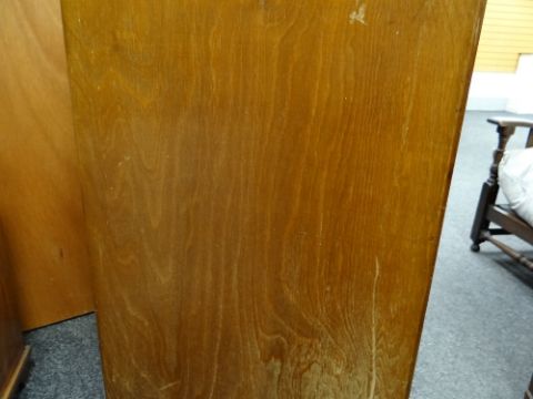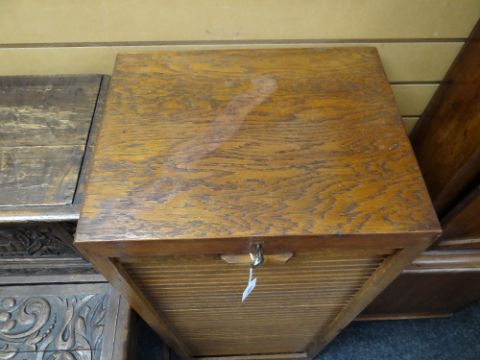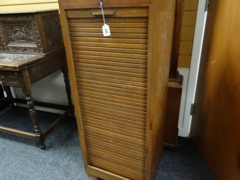 MID-CENTURY ELM TAMBOUR FRONT STATIONERY CABINET, fitted with 9 open faced drawers, key lock, 46.5 x 36.5 x 114.5cms, drawers internal dimensions 30 x 37.8cms