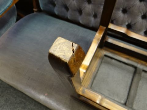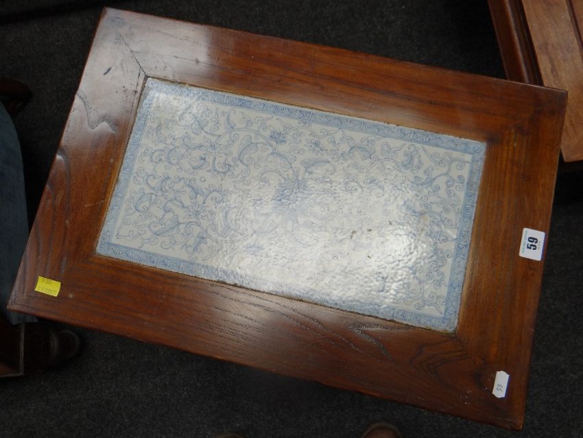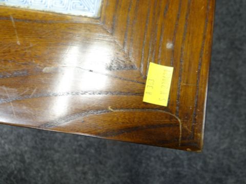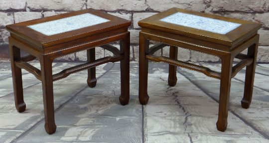 PAIR CHINESE ELM & PORCELAIN INSET TOP OCCASIONAL TABLES, 55 x 37cms (2)There is general wear to both, light scuffs and scratches.A few of the feet have splits on the underneath, but both feel structurally solid.There are nibbles around the porcelain edges on both tables but no cracks.The porcelain on one table has faded, one looks a much lighter blue than the other.
