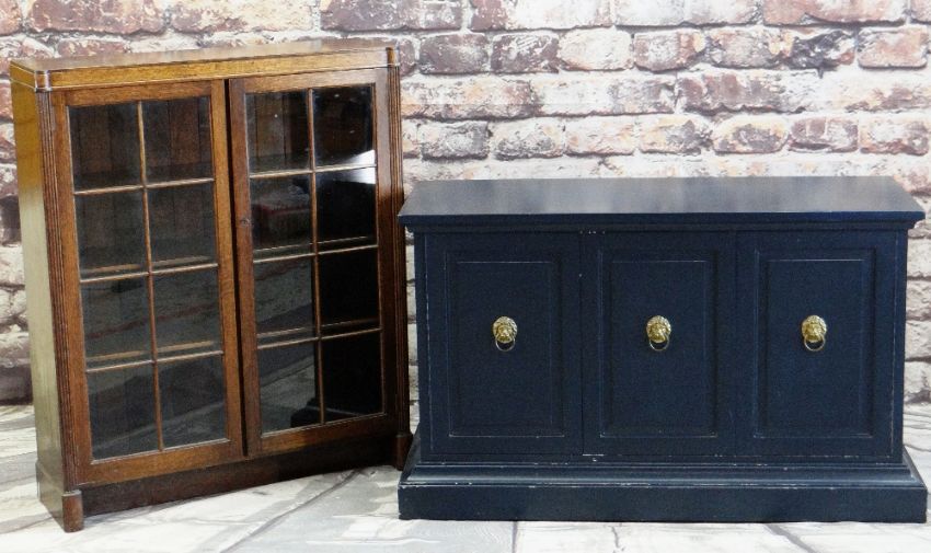 EARLY 20TH CENTURY OAK BOOKCASE & PAINTED CABINET, bookcase with glazed doors and reeded uprights, 91 x 28 x 112cms; blue-painted cabinet with triple folding cupboard doors centred with lions mask handles, 122 x 49 x 76cms (2)