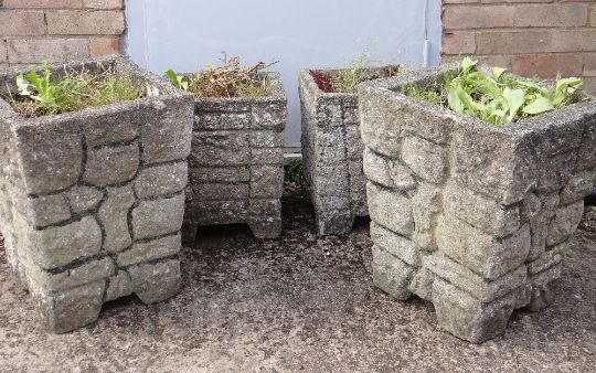TWO PAIRS OF SQUARE COMPOSITION STONE PLANTERS, 37cms and 46cms high respectively (4)
