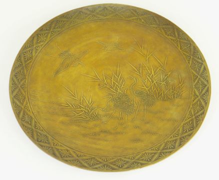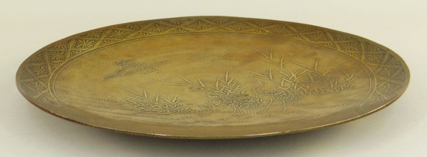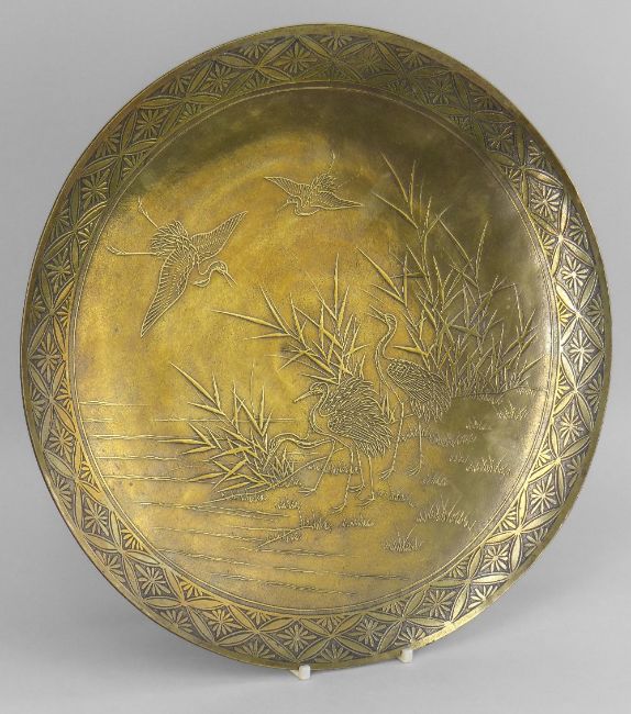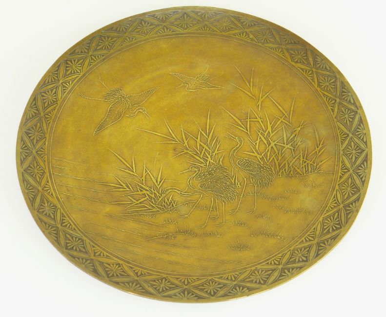 JAPANESE BRONZE DISH BY THE HAMADA STUDIO, decorated with four tsuru amongst reeds beside water, within brocade diaper border, raised on low bamboo form foot, the back patinated in brown, signed in a cartouche 'Hamada Sei', 31cms diam.