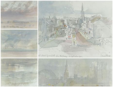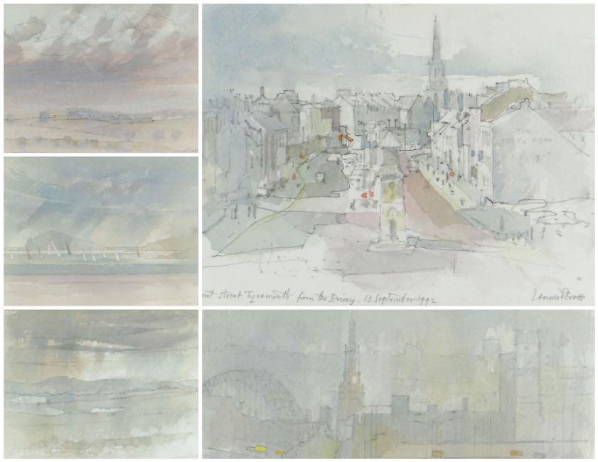 LEONARD EVETTS watercolours - various titles including 'The Solway at Rock Cliff', 'Towards All Saint's Church, Newcastle', 'Evening Light Over Simonside, Northumberland' and 'Front Street, Tynemouth', all signed and dated in pencil, all about 19 x 28cms (5)